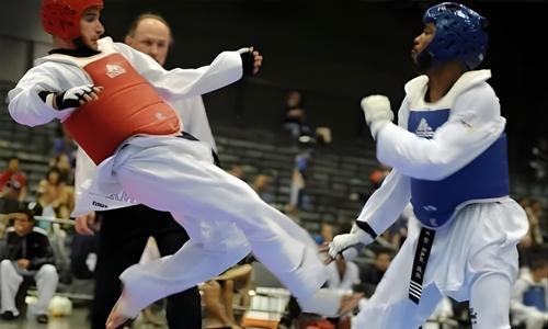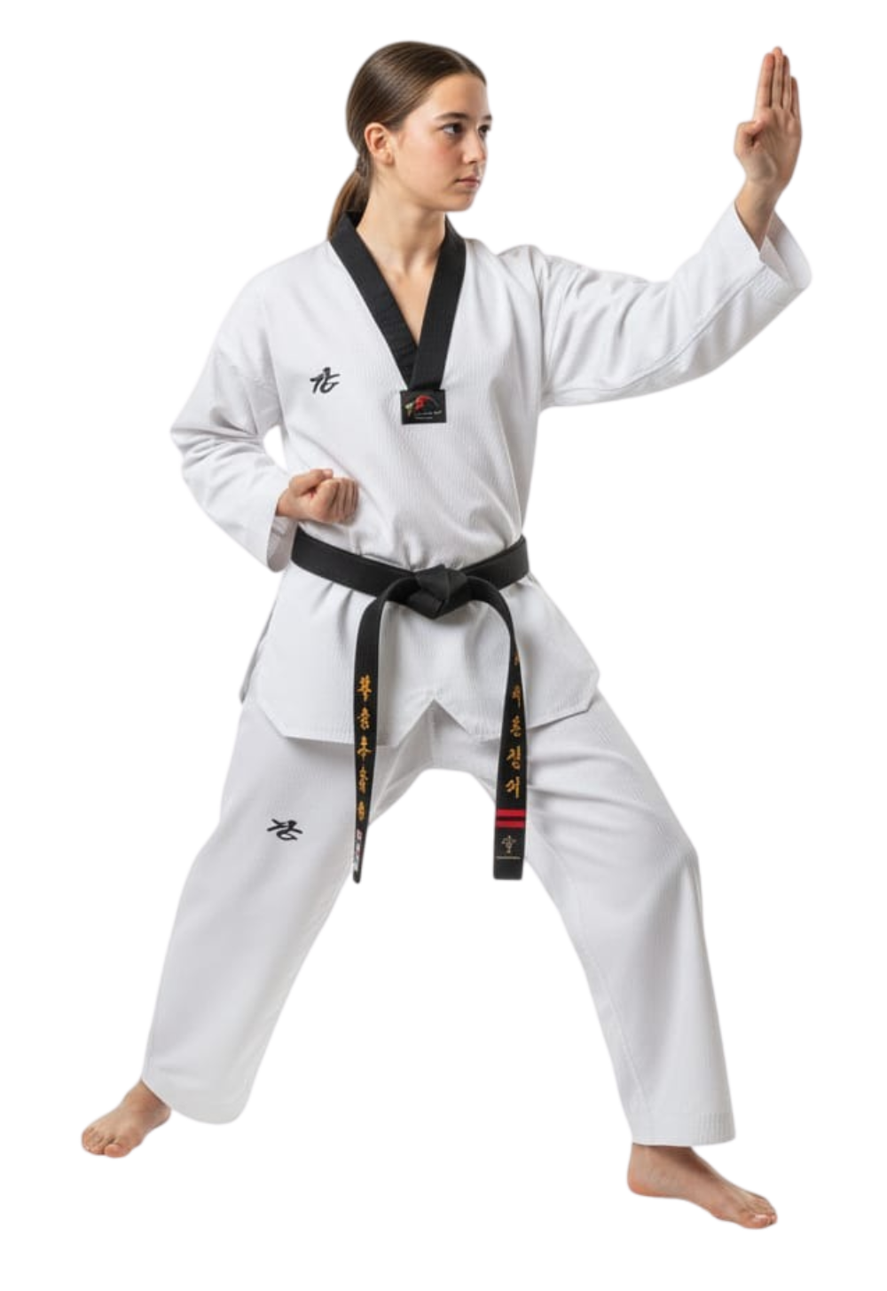 Taekwondo training helps improve physical strength, stamina, and flexibility while promoting balance, endurance, and overall body fitness.